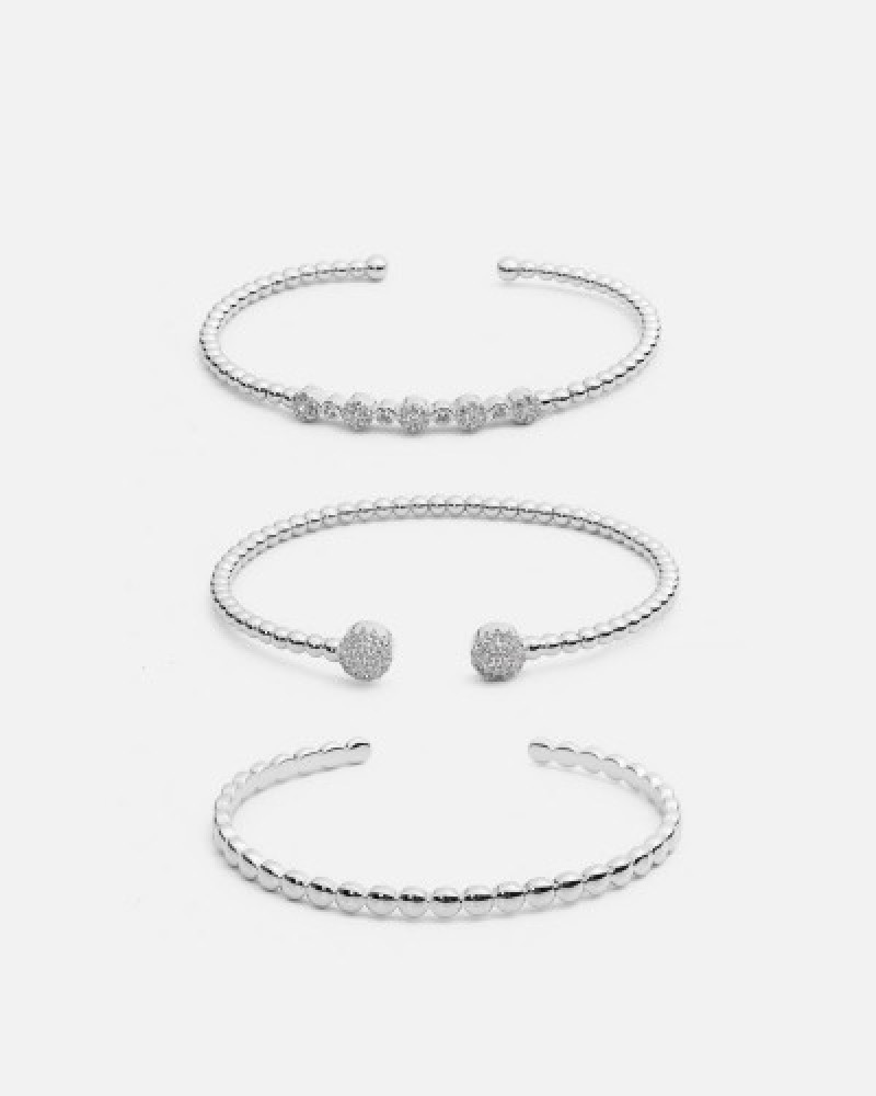 طقم اساور نسائية من ماركة زايروس باللون الفضي ، اساور بتصميم عصري، طقم من الاساور مكون من ثلاث قطع منفصلة بتفاصيل مختلفة وبنهايات مفتوحه لتتحكمي بمقاس الاسواره على يديك ، تتميز الاسوره الأولى بتصميم بنهايه مفتوحه وبحلي في نهايتها بشكل دوائر مرصعه بفصوص من الزركون اللامع ، والاسواره الثانيه تميزت بتصميمها الناعم البسيط بحلي في المنتصف تتزين بفصوص الزركون ، اما الاسواره الثالثه تميزت بتصميما الناعم وبحلقات متتابعة ، هذه المجموعه من الاساور إختيارك المثالي لإضافتها الى مجموعتك .