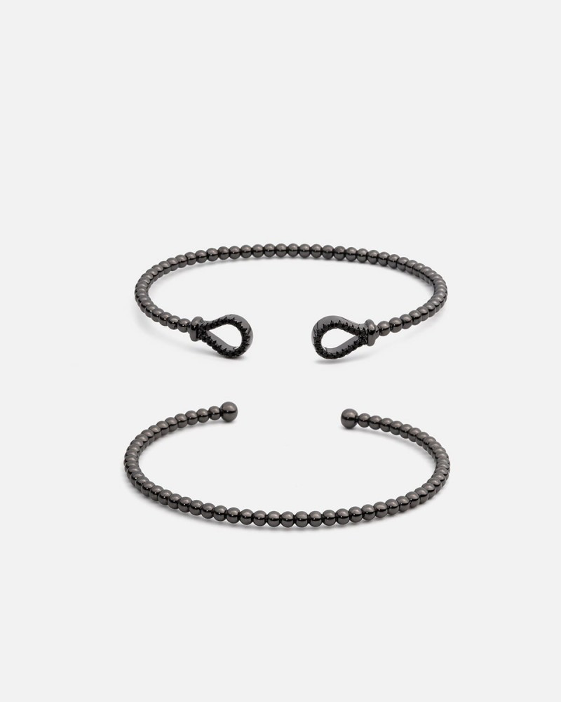 اساور نسائية من ماركة زايروس ، طقم أساور بتصميم مميز يتكون من اسورتين باللون الأسود ، صممت هذه الأساور بتصميم مميز وخفيف لكل أسوره لتكون خفيفه على معصمك ولنترك لك حريه الإختيار في لبسها معا او الإختيار بينهم ، تتميز المجموعة بتصميم بسيط وبنهايات مرصعة بفصوص لامعة لإطلالة ناعمة وبنهايات مفتوحه لتتحكمي بمقاس الاسوره على يديك ، نسقي الاساور مع طلتك اليوميه لتضيفي إليها المزيد من التألق .