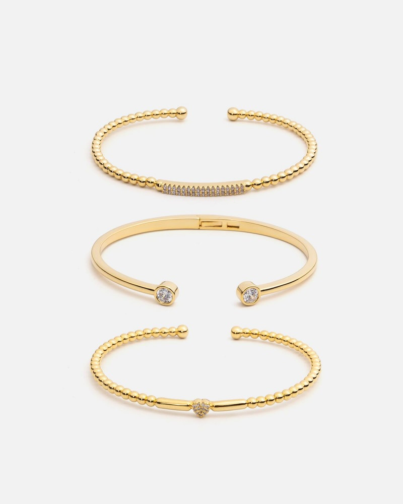 طقم اساور نسائية من ماركة زايروس باللون الذهبي ، اساور بتصميم متفرد ، طقم من الاساور مكون من ثلاث قطع منفصلة بتفاصيل مختلفة وبنهايات مفتوحه لتتحكمي بمقاس الاسواره على يديك ، تتميز الاسوره الأولى بتصميم بنهايه مفتوحه وبحلي في نهايتها بشكل دوائر مرصعه بفصوص من الزركون اللامع ، والاسواره الثانيه تميزت بتصميمها الناعم البسيط بحليه في المنتصف تتزين بفصوص الزركون ، اما الاسواره الثالثه تميزت بتصميما الناعم و مرصعه بفصوص الزركون البراقه ، هذه المجمرعه من الاساور إختيارك المثالي لإضافتها الى مجموعتك .