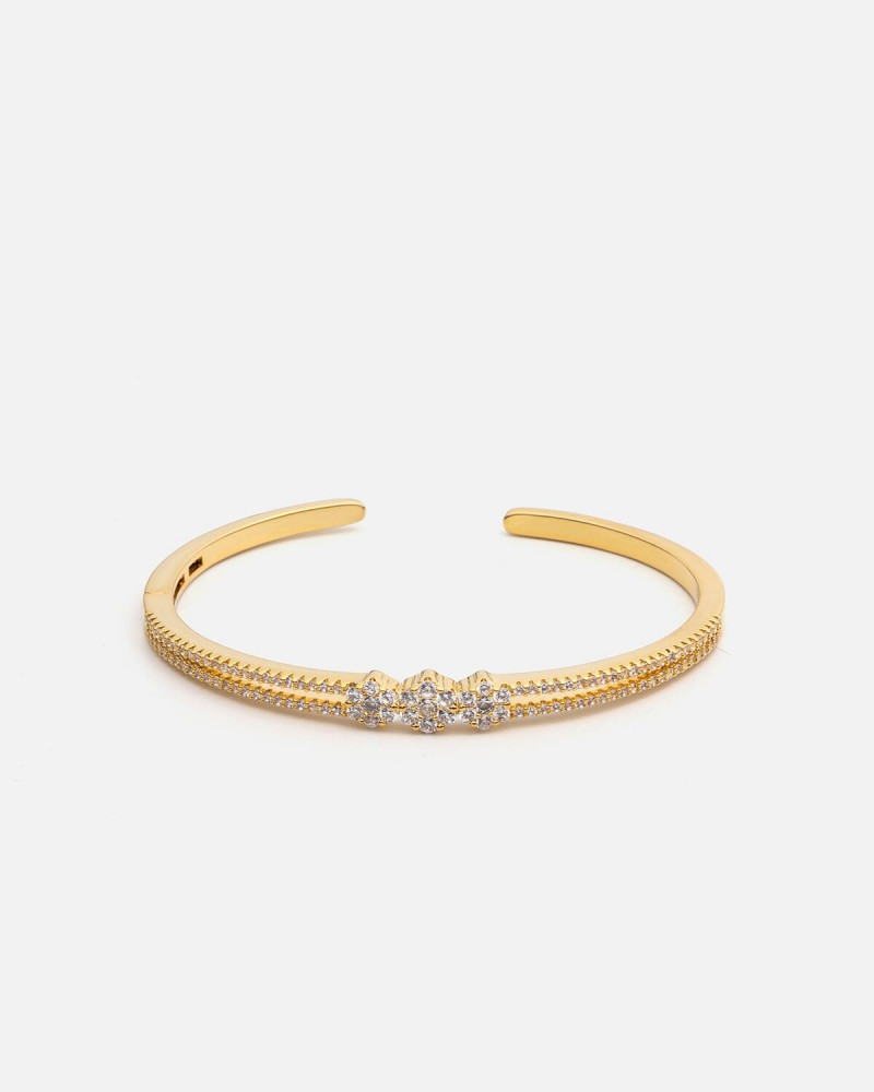 اسوارة نسائية من ماركة زايروس ، اسوره باللون الذهبي بتصميم عصري وأنيق ، تتميز الإسوارة بتصميم اسورتين تتزين بفصوص الزركون اللامع وبحلي في المنتصف بشكل وردة تتزين بأحجار من الزركون البراق، يمكنك التحكم من مقاس الاسوارة على يديك ، نسقي السواره مع إطلالة مسائية لطلة ملفتة وأنيقة.
