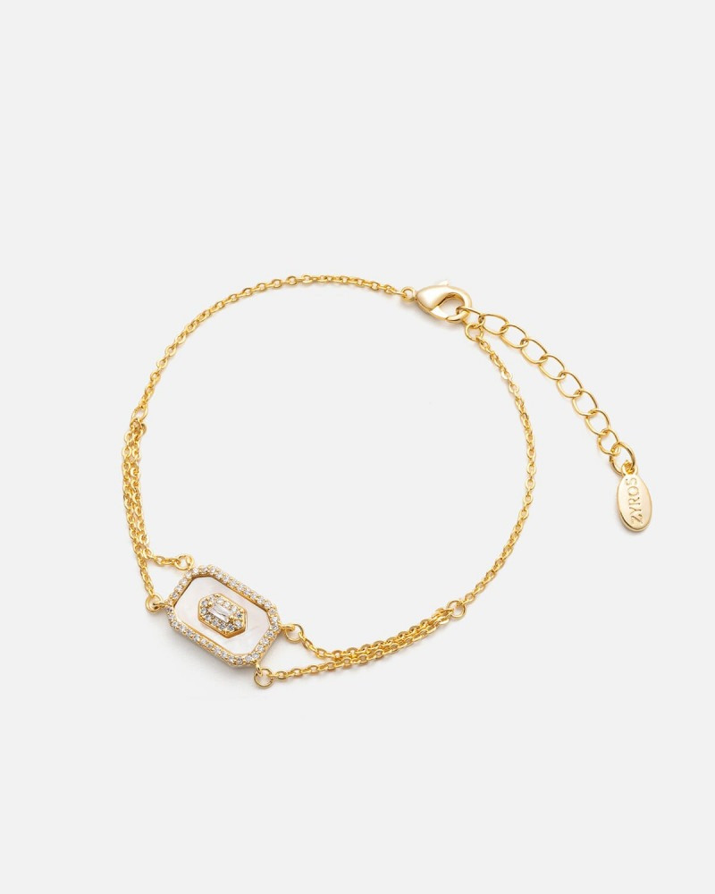 اسوارة نسائية من ماركة زايروس بتصميم ملفت ، اسورة باللون الذهبي بتصميم حلية بشكل مربع باللون الأبيض الصدفي وتتزين بحجر زركون لامع فالمنتصف ، اسورة أنيقة تناسب اطلالتك اليومية لا تتردي في إضافة الاسوارة الى مجموعتك لتحضي بطلة مميزة.